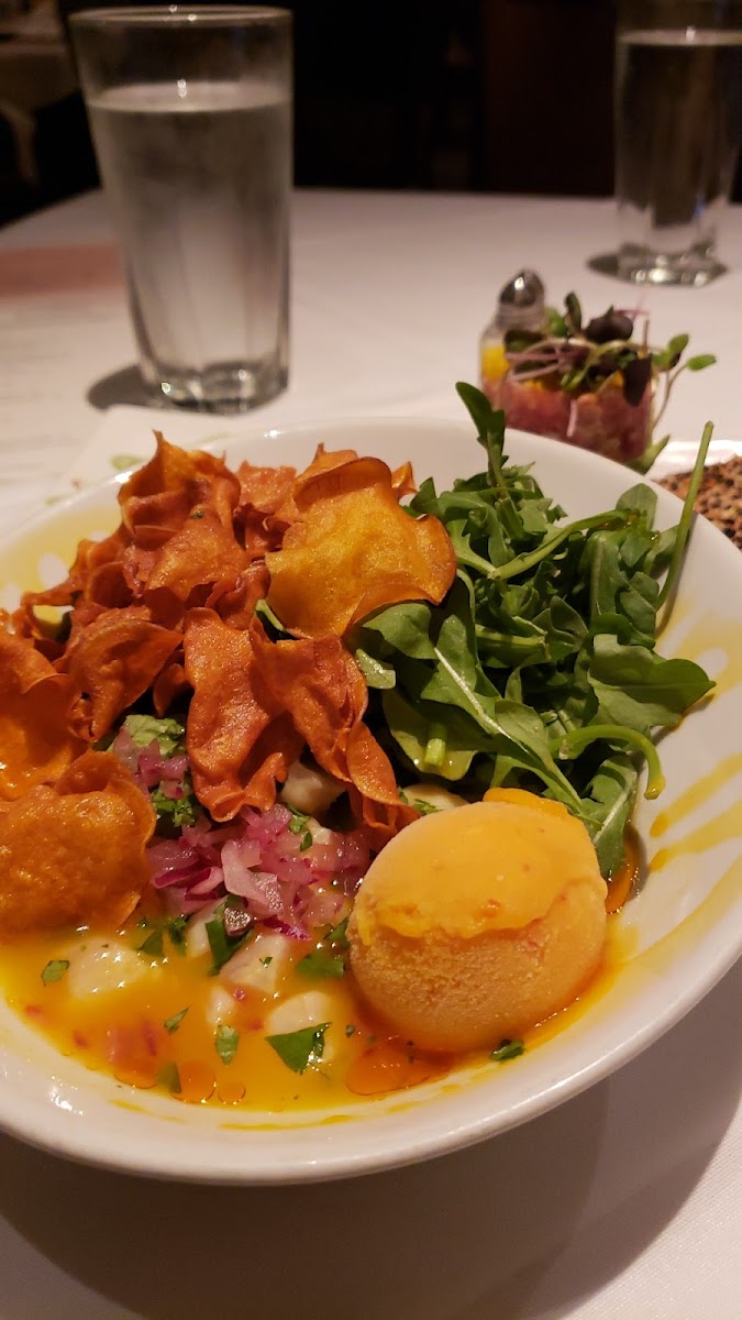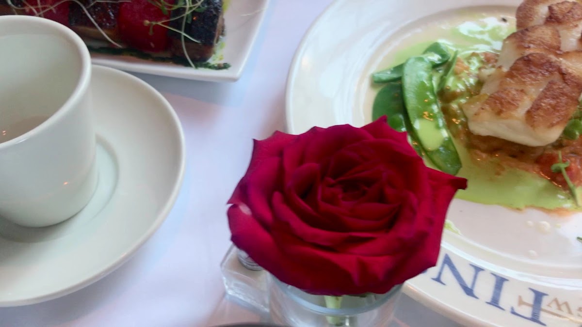 We went here for our anniversary and we were treated so well, it really did help make our day special. Multiple staff members wished us a happy anniversary. When we arrived at our table, there was a personalized souvenir menu and confetti on our table. We ordered dessert after our meal, but they also brought out two chocolates on a plate with "Happy Anniversary" written in chocolate and a candle. The menu had so many great sounding items on it, it was hard to choose. We shared the panko breaded calamari appetizer, which was tender inside and crispy on the outside. Wonderful sauce. I ordered the Scalibut, a creation of scallops seared onto a halibut filet, served with orzo and snow peas. It was light tasting and fresh. My husband had the yellowfin tuna. I didn't taste it but he really enjoyed it. I had the creme brulee for dessert which was bigger than I expected, and my husband had a coconut on the half shell homemade sorbet dessert in a chocolate shell. Yum! The restaurant has a contemporary decor. The prices were surprisingly reasonable. I would highly recommend them.